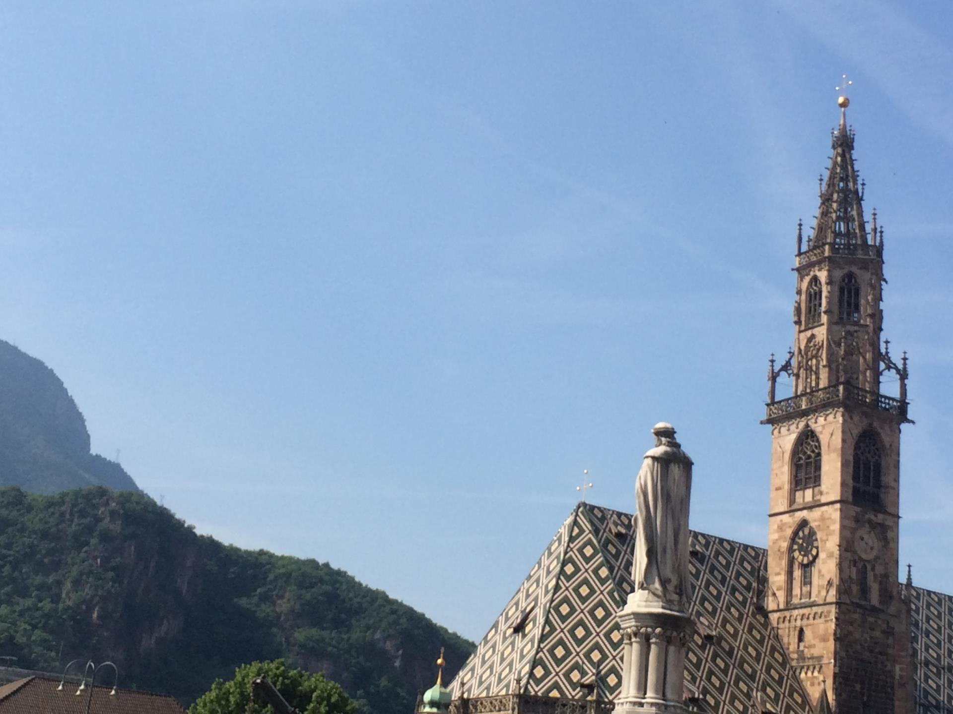 Der Bozner Dom hebt sich von einer Kulisse aus Berggrün und Himmelsblau ab. Alles scheint nach oben zu streben, imposant und doch filigran. Er zieht alle Blicke auf sich. So auch jene des zarten Walthers, dem Namensgeber des beliebten Platzes, auf dem auch Bozens bekannteste Veranstaltungen vom Speckfest bis hin zum Christkindlmarkt stattfinden. Der Minnesänger scheint sie regelrecht zu fixieren, Bozens berühmteste Kirche - und so grüßen wir ihn nur kurz, um dann tiefer in Kunst, Geschichte und Kunstgeschichte des Doms Maria Himmelfahrt einzutauchen. Von hier aus geht es dann weiter über den Dominikanerplatz zur Dominikanerkirche mit dem Kreuzgang und den sehenswerten gotischen Malereien. Dann lenken wir die Schritte an der Freien Universität vorbei und bald links ab über die berühmte Talferbrücke, die uns ihre Geschichte erzählt. Vielmehr, die Talfer selbst ist es, die darunter hindurchrauscht, die plätschernd und gurgelnd von ihrem Weg berichtet. Drüber hinweg rauschen dann die Autos, Motorräder, Menschenmengen. Alles bewegt sich Richtung Siegesdenkmal, in dessen Souterrain die Geschichte des letzten Jahrhunderts dargestellt ist und sich dann so einiges erklärt, das man heute schon erlebt hat.