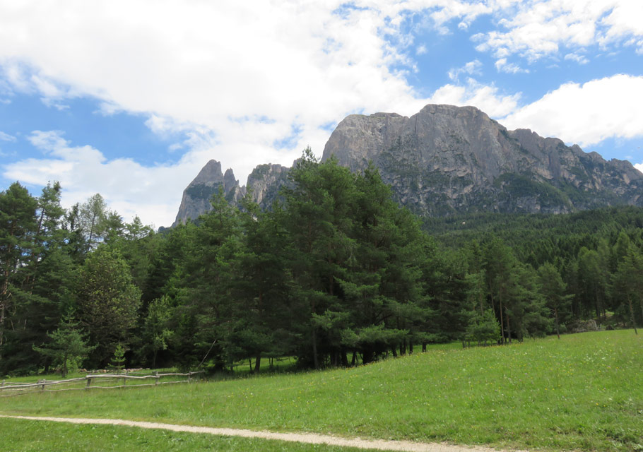 Als sich plötzlich der Waldweg weitet und eine erfrischend grüne Wiese mit wunderbarem Blick auf den Schlern wie aus dem Nichts auftaucht, gönnen wir uns doch einen kleinen Stopp. Die Sonne tut es uns gleich und lässt den Himmel zwischen den Wolkenschwaden blau erstrahlen.