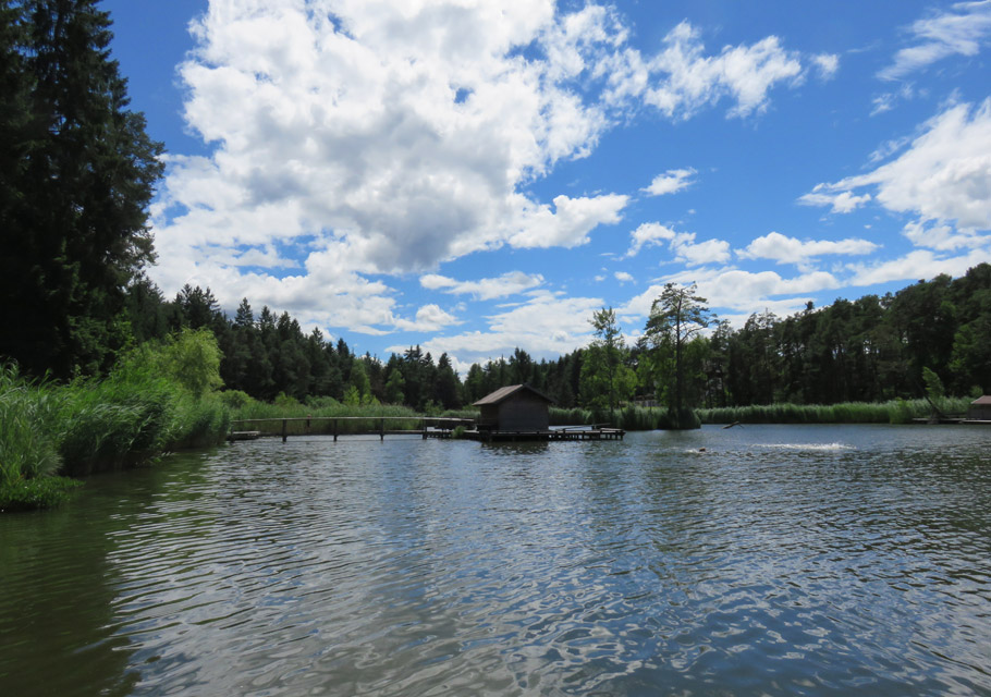Auch wenn man es hier noch deutlich länger aushalten könnte, setzen wir unseren Marsch fort. So viel Sonne wie möglich möchten wir noch beim Weiher genießen. Als sich nach dem letzten Stück durch den Wald schon der See zu erkennen gibt, müssen wir dennoch feststellen: Die Wolken waren schneller als wir und haben sich schon großzügig ausgebreitet. Im romantischen Tango tanzen sie mit den Strahlen der Sonne.