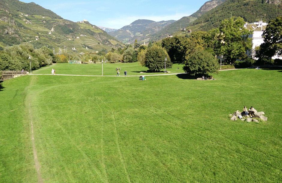 Von wunderbaren Ersteindrücken und exquisitem Mittagsschmaus gleichermaßen gesättigt, wollen wir mit einem Verdauungsspaziergang in den sommerlichen Nachmittag starten. Bozen hat reichlich Grün aufzuweisen. Die nächstgelegene Erholungszone ist die weitläufige Talferpromenade mit den ‚Talferwiesen, die sich da sanft neben der Talfer entlang nach Norden zieht. Hundepäärchenskateboarderkinderseniorenfamilienkünstlerfußballer - auf den Talferwiesen ist für alle Platz und sie radeln, sonnen sich, schlecken Eis, knipsen Bilder. Tüchtige Zu-Fuß-Geher begeben sich dann auf die Oswald-Promenade, wo der Fotoapparat kaum zur Ruhe kommt, bietet sich von manchen Stellen doch ein grandioser Blick über Bozens Dächer.