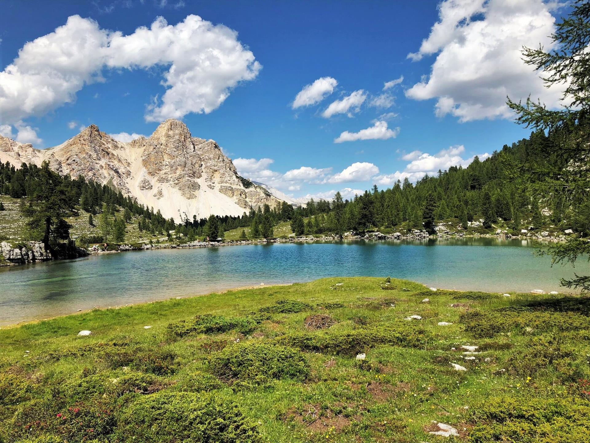 zwischen zwei Naturparks – dem Naturpark Sextner Dolomiten und dem Naturpark Fanes-Sennes-Prags, was ihm sein atemberaubendes Bergpanorama schenkt. Rund um den See finden sich auf