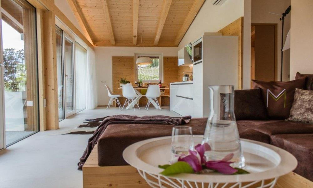 A special highlight of the Moar Lodge is the tasting of the wine produced on her family farm. The high-quality furnishings of the lodges offer every comfort, while guests are also offered welcome gifts such as mineral water, Moar Lagrein wine, Moar apple juice and homemade jams.