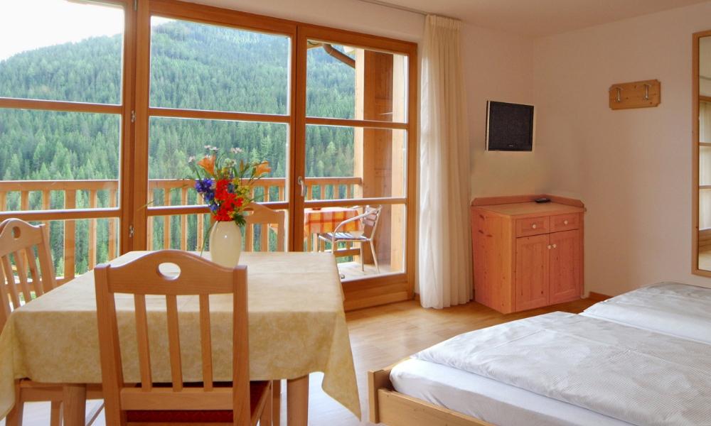 Evelin Crazzolara has been actively running the apartments as a business since 2005 with the help of her husband and their two children. For Evelin it is very important to create an atmosphere where guests can feel at home, recuperate and learn about Ladin culture: the classic style of the establishment also reflects Ladin traditions, with natural wood taking pride of place.