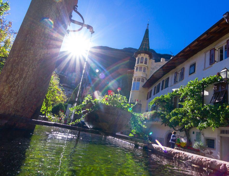 From the main town, Kurtatsch, you can take the wonderful wine trail to Entiklar – following your nose, in the truest sense of the word! :-) On the way there is a series of little clay amphorae where you can “sniff” your way into the world of wine. At the end of the trail lies this hamlet (just 150 inhabitants!) idyllically embedded among flowering vineyards. The Turmhof, a 13th-century residence, stands in the midst of Entiklar, surrounded by a magnificent park and (to me) very reminiscent of a palace. There is even a fairytale garden with a pond where white swans glide past painted and crowned stone figures.