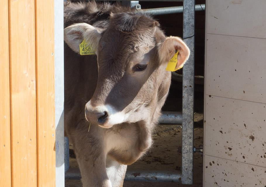 Prima di rimettermi in cammino, do un'occhiata alla nuova stalla libera, dove un bue si gode un massaggio con la spazzola elettrica. Al Dorfner i buoi trascorrono anche molto tempo nei pascoli di Castelfeder, e grazie all'alimentazione naturale crescono lentamente. Il sapore della carne non può che ricordare la natura!